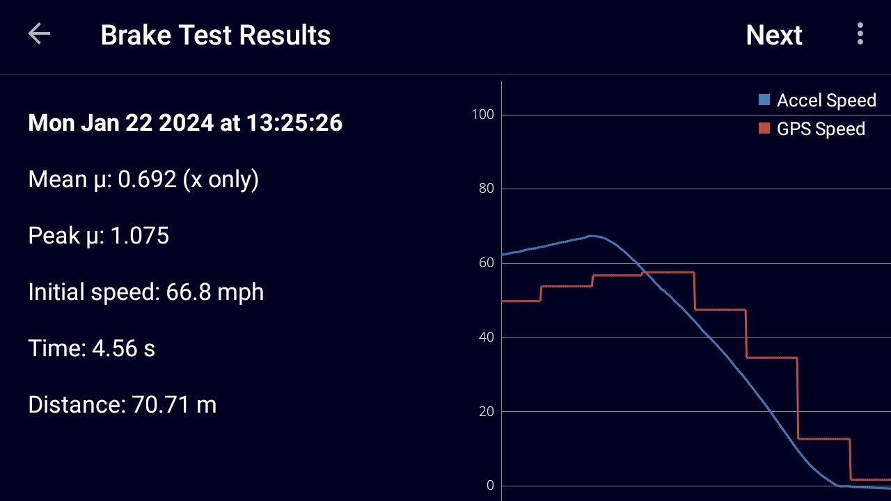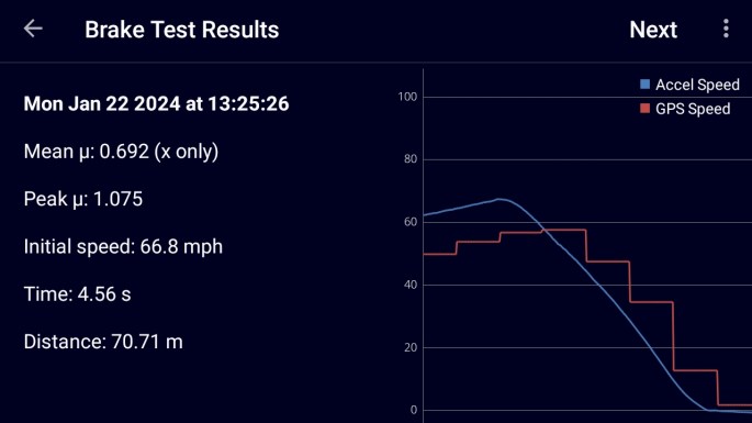 You can use a free phone App such as iAccel Lite to test your braking ability. It shows initial speed, distance to stop and average braking g force, which should be 0.67g minimum to meets Highway Code braking distances. The theoretical limit is 1g after which most bikes will start to tip up. The best riders can stop in 80% of the published distances.