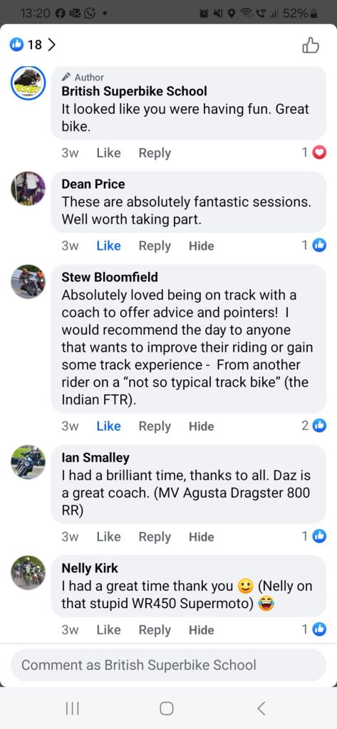 2. I canโ€™t recommend this highly enough Iโ€™ve been riding a lot of years on road and track but still learnt so much experience, my first session I was very nervous but relaxed after that for the rest of the day my instructor was Alex (Hutchy) ex racer who was absolutely amazing got me relaxed on the bike and riding smother than I ever have and got some good advice of Gareth the instructor riding behind me and on the briefing telling me where I can improve if you want to improve your riding this is the place you need to be. ๐Ÿ‘
