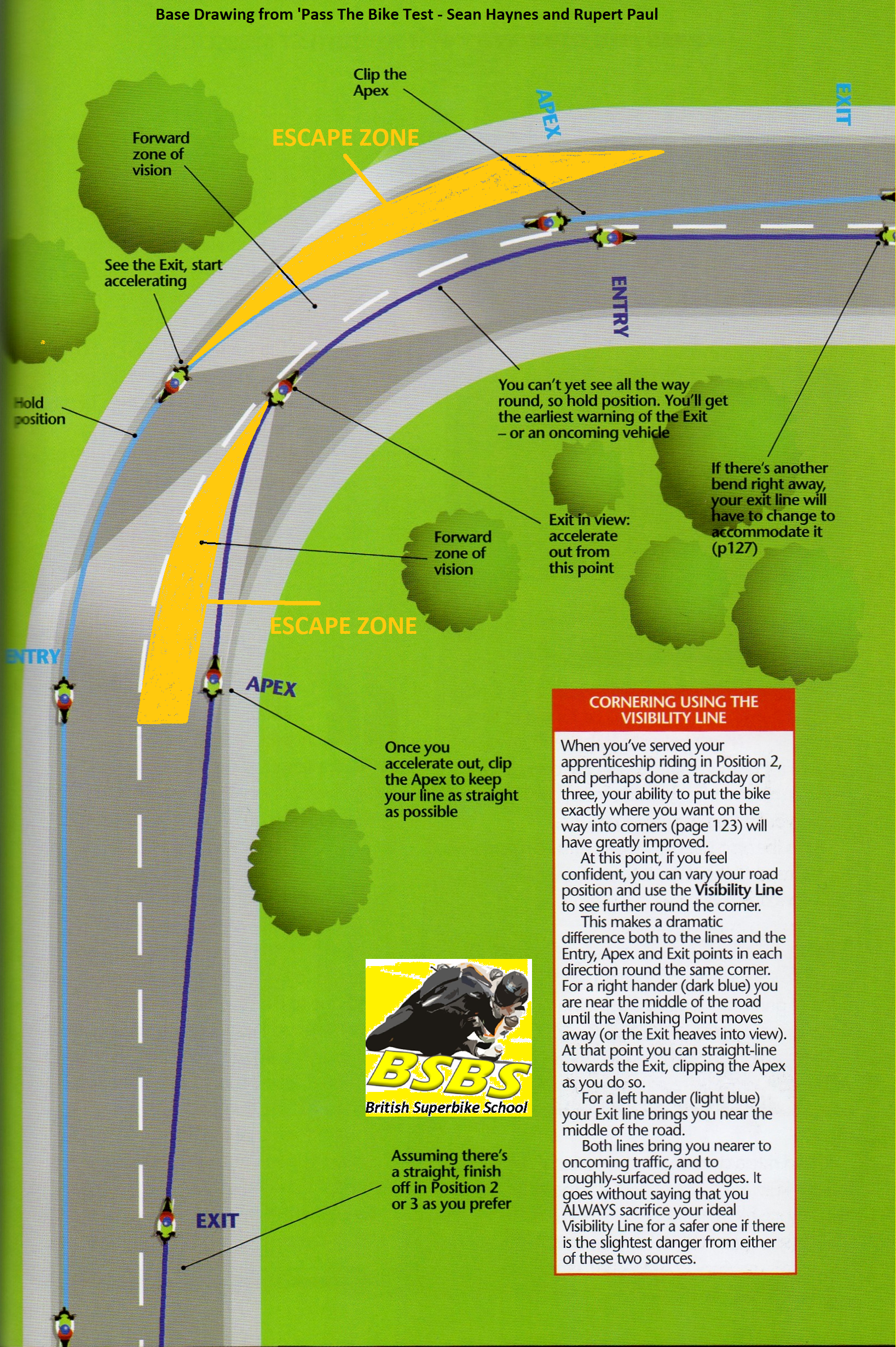We also suggest you use this approach to cornering on the road or track – slow in, fast out – using the diagram below. It is based on a drawing from Rupert Paul’s Book – ‘Past Your Bike Test’. The yellow ‘escape zones’ have been added.